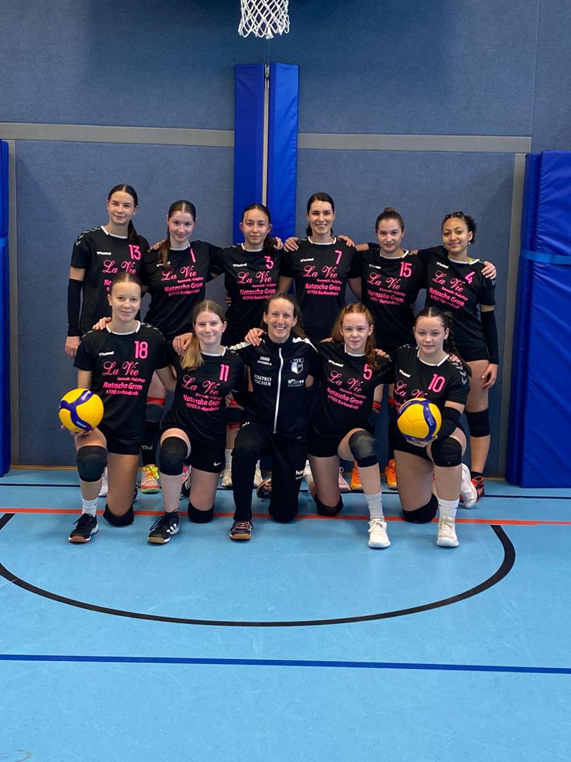 Das Foto zeigt das Team nach der Aufholjagd im dritten Satz gegen Volkach (hinten von links) Trainerin Sabrina Urschlechter, Kim Schmitt, Gloria Heilmann, Zoe Grom, Katharina Kriese, Lia Urschlechter, Emmi Vorndran, Jana Urschlechter, Ina Wolf, (vorne von links) Jana Wolf, Eva Haase und Lena Schmitt